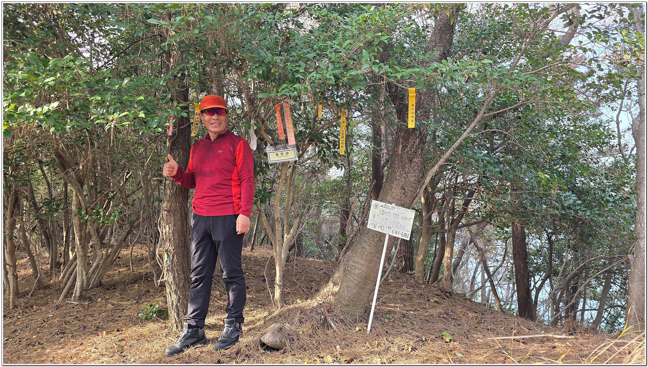 희미한 길을 따라 오르면 대일해운에서 설치한 조그만 표지판을 지나 호두산 정상에 올라선다.