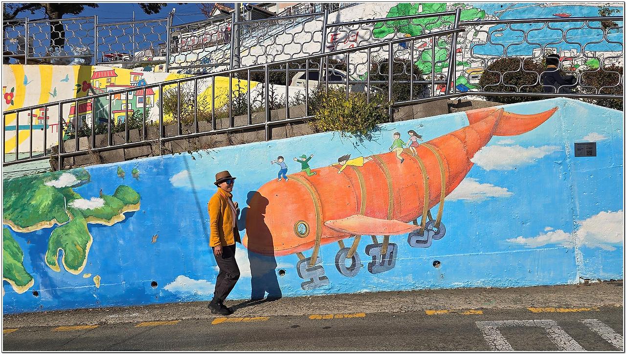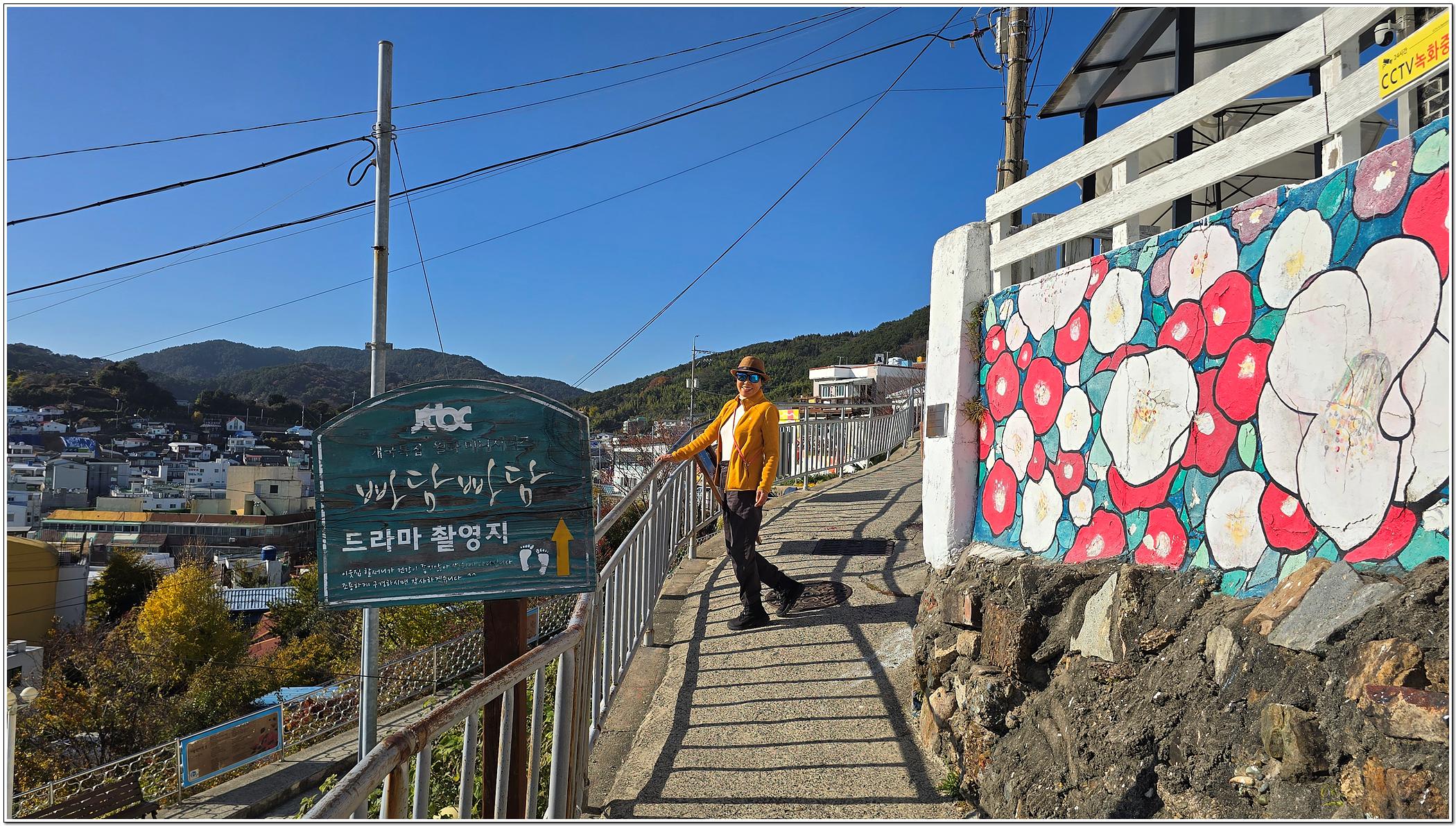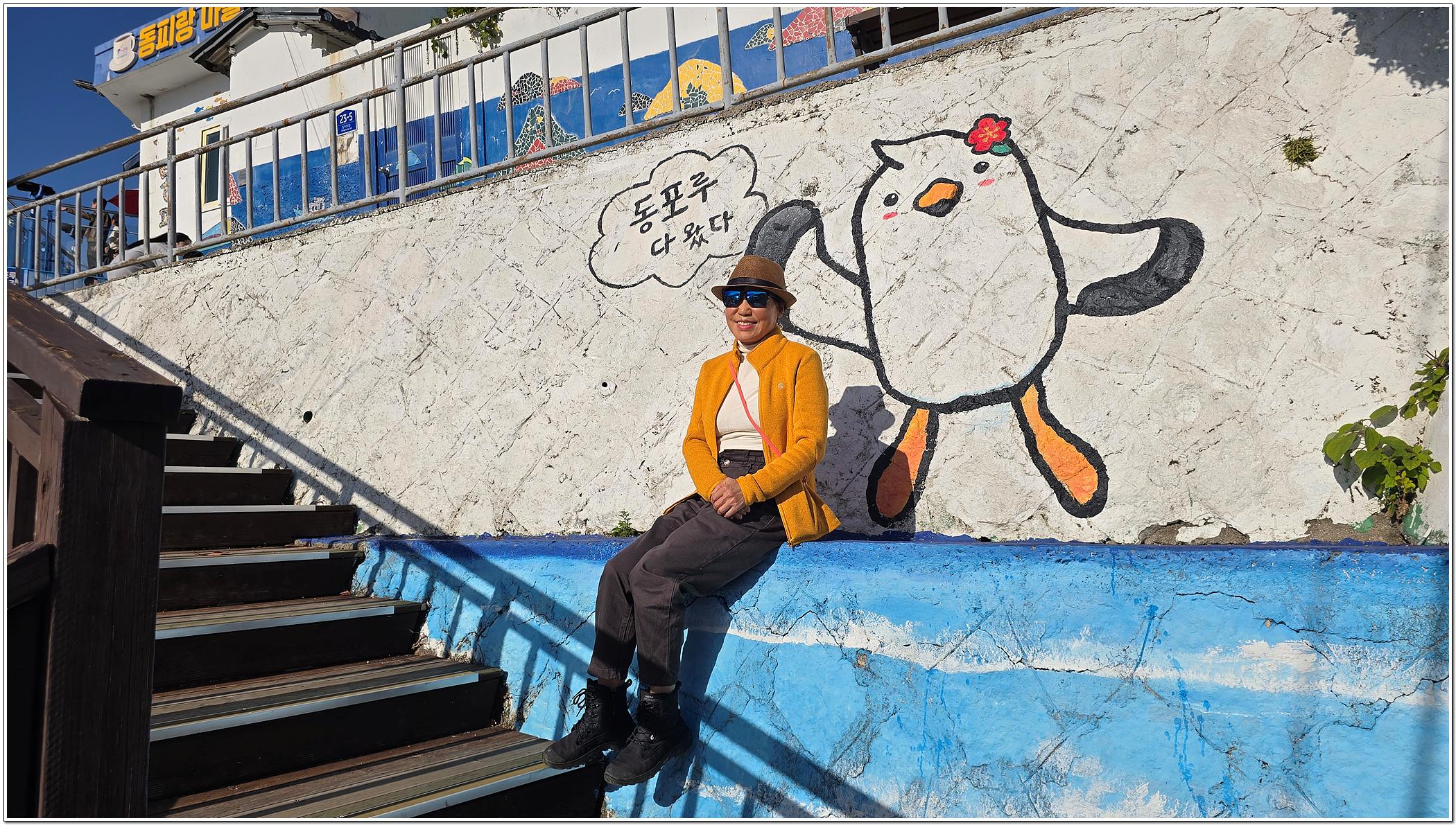 구불구불한 오르막 골목길을 따라 강구항이 한눈에 내려다보이는 동피랑마을에 오르면 담벼락마다 형형색색의 벽화가 눈길을 끈다.