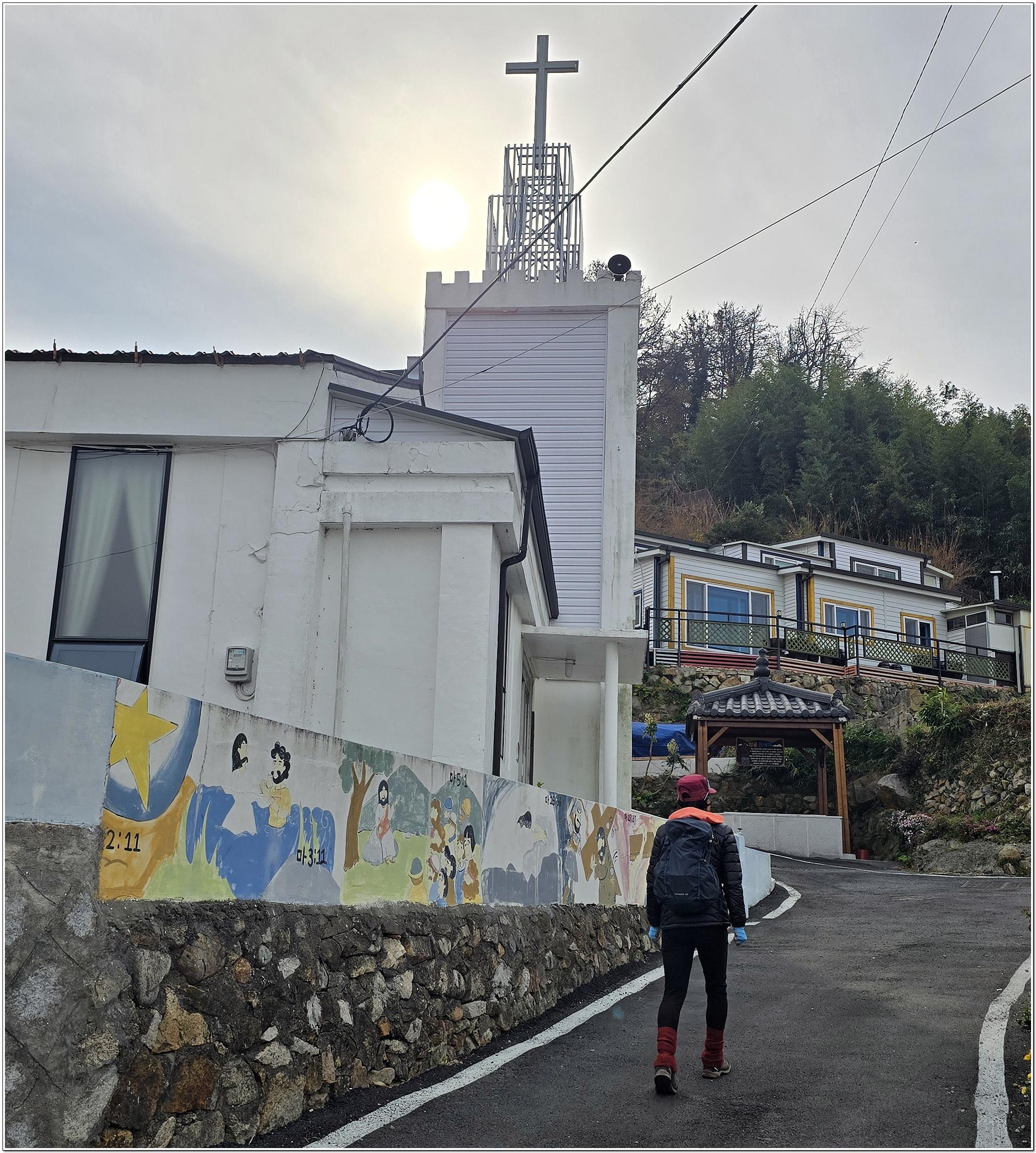 용초항에서 산행을 시작하여 도로를 따라 오르면 교회를 지나 오르막 임도가 이어진진다.
