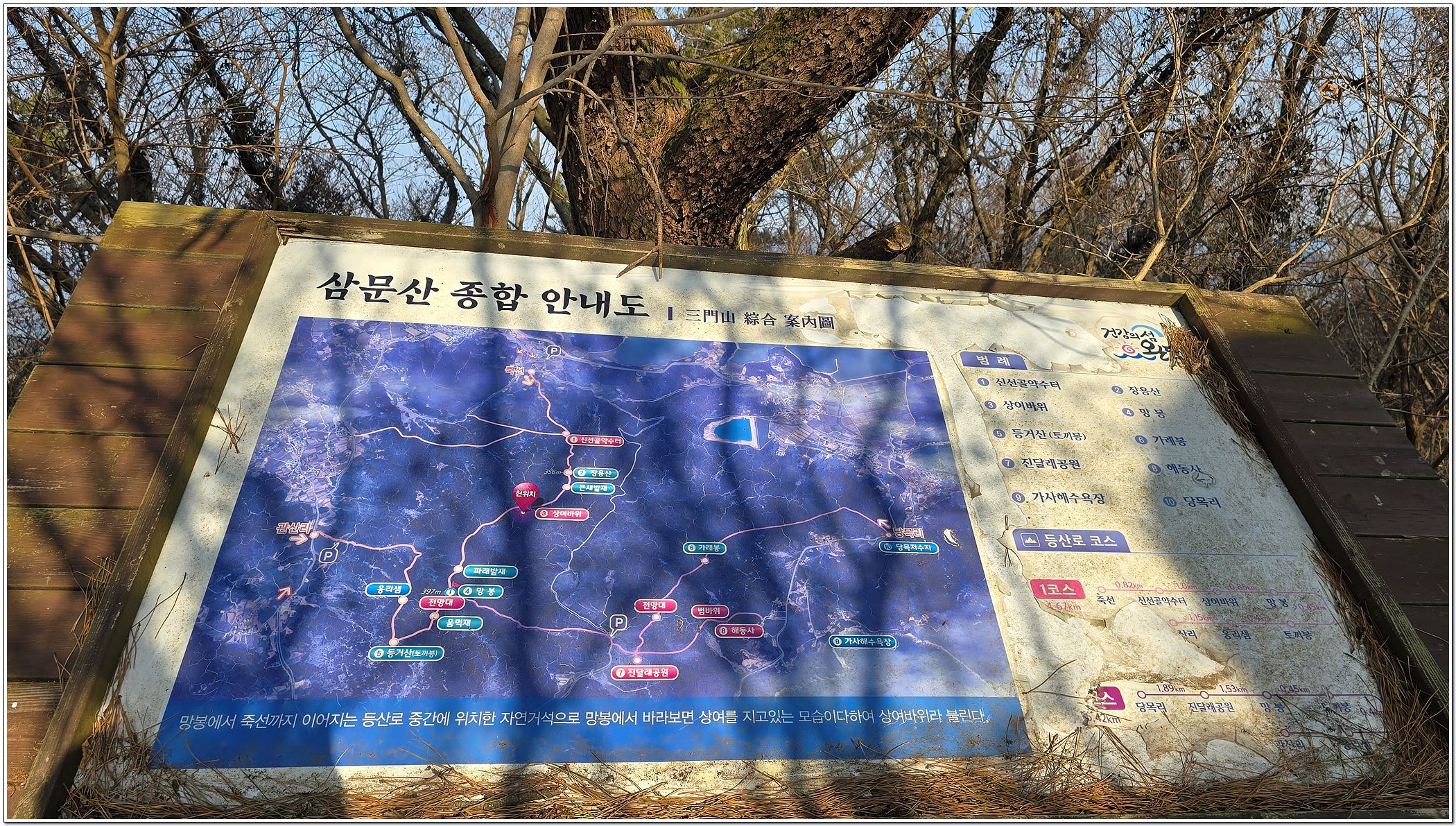 다시 도로를 따라 잠시 오르면 삼문산자연공원이라는 푯말과 좌측으로 망봉으로 오르는 넓은 등산로가 이어진다.