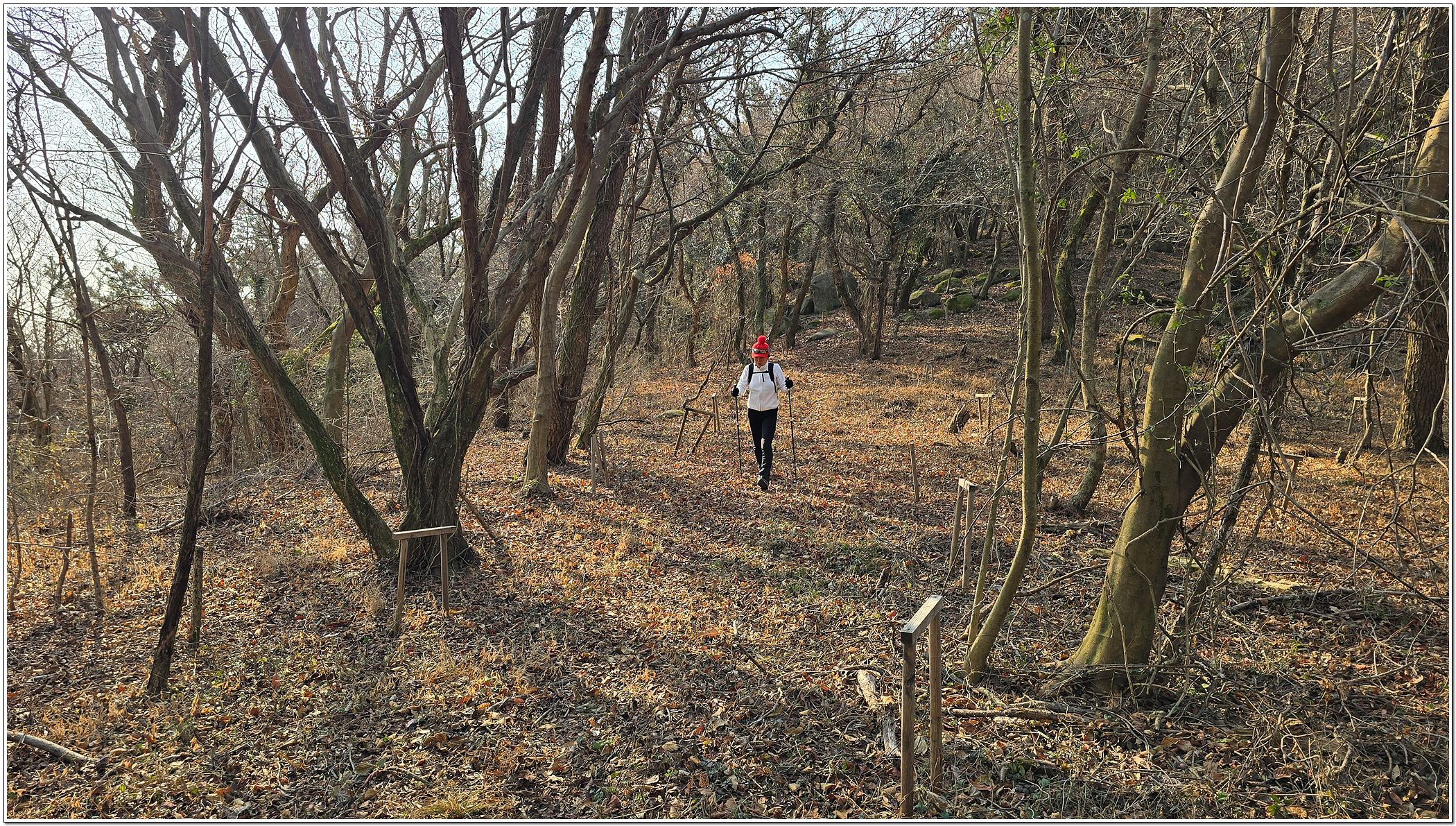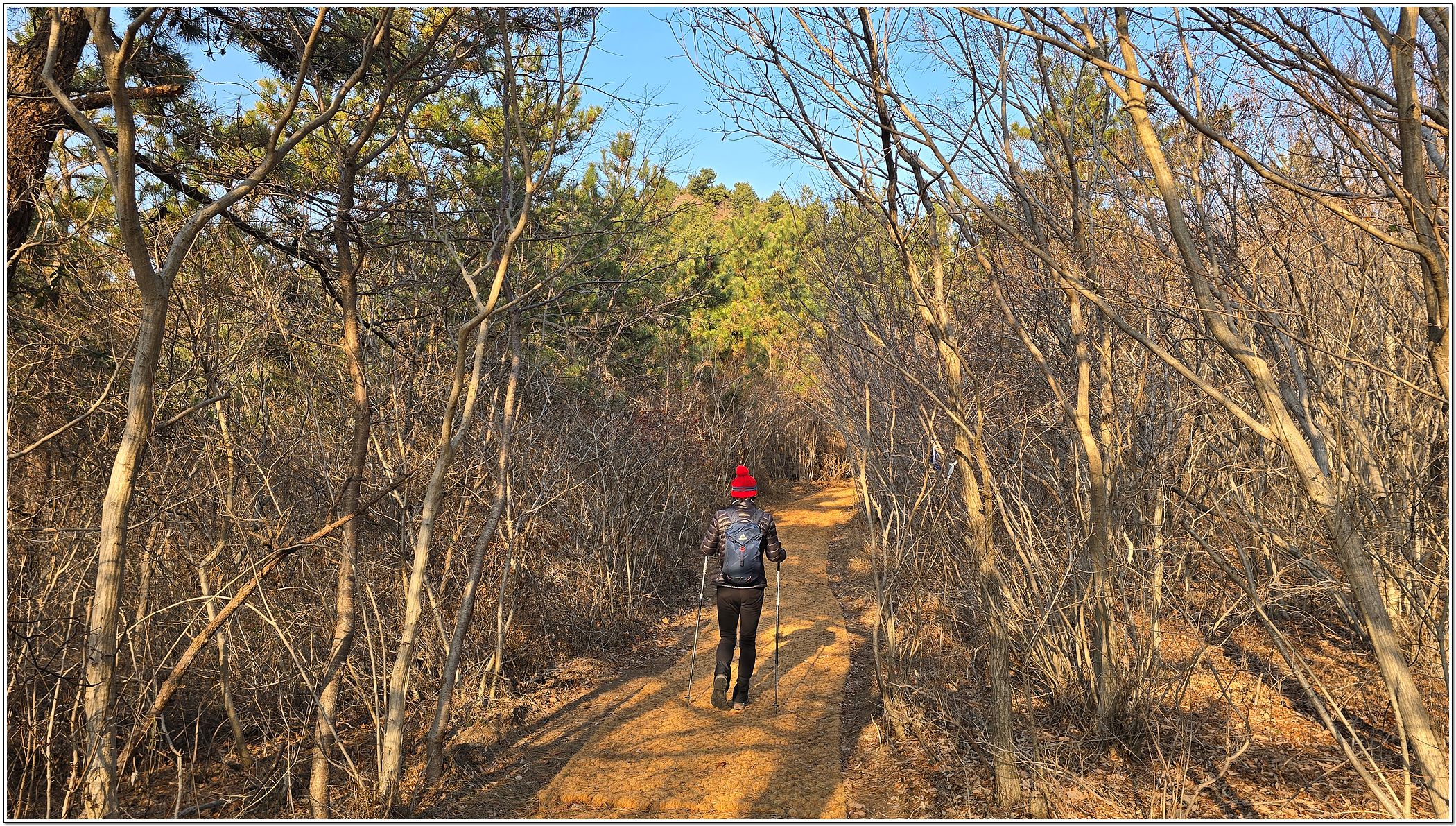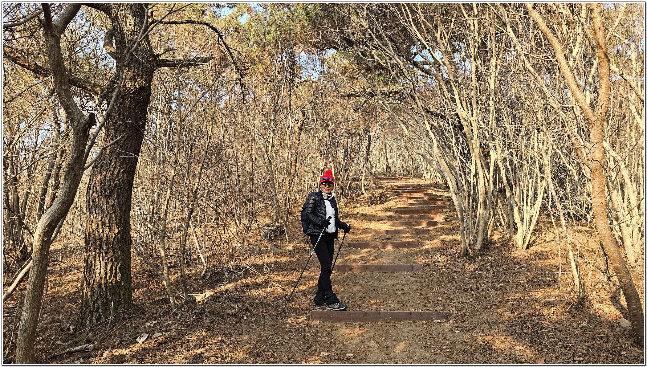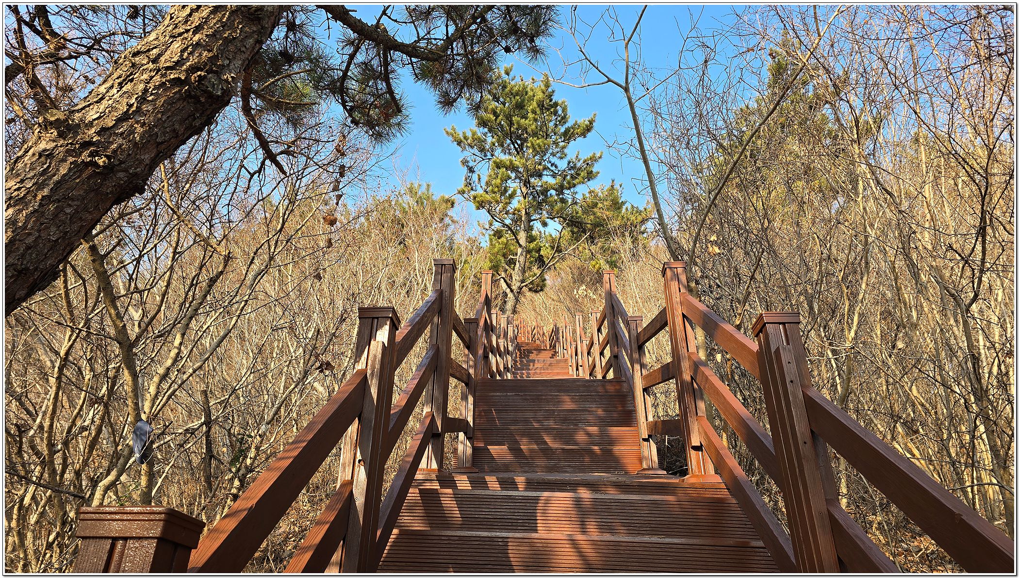 임도 수준의 등산로를 따라 오르면 야자매트길을 지나 가파른 계단의 오르막이 이어진다.